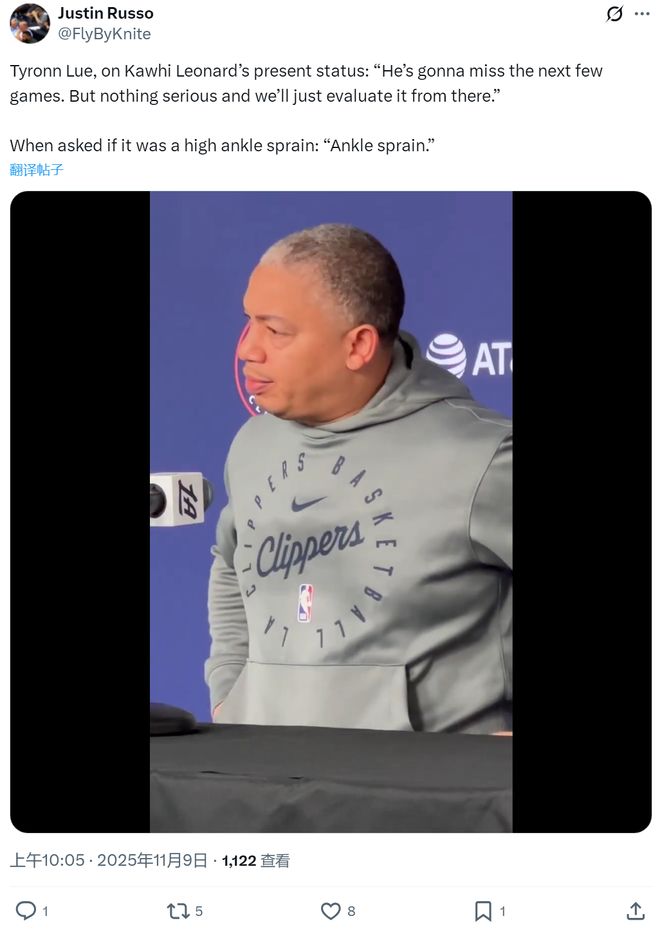 北京时间11月9日,NBA常规赛,快船主场迎战太阳。赛前新闻发布会,快船主帅泰伦卢透露,伦纳德脚踝扭伤,归期未定,未来几场都不打。记者问小卡扭伤程度,泰伦卢表示并不算太严重。快船本来战绩就不行,如今雪上加霜。
